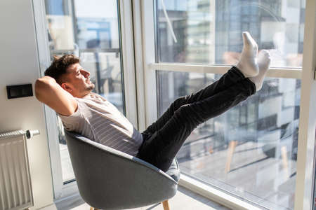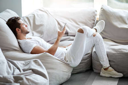 Young man, sits in comfy chair with his stretched legs, is using mobile. Early morning time.