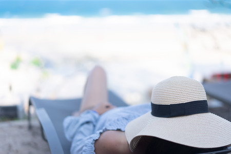 Close-up of the man's foot while resting on a sunbed in the blue water on the tropical pool and sea view. Holiday, vacation summer background with copy space.