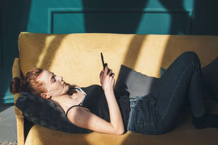 Adorable ginger woman is lying on the couch chatting on mobile wearing a skin care paper mask