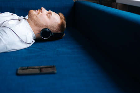 Young handsome man listening to relaxing music, lying on the couch. pleasant music, relaxation. Concept of music relaxation.