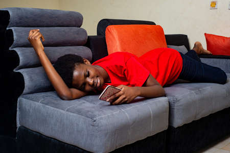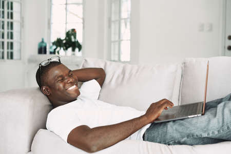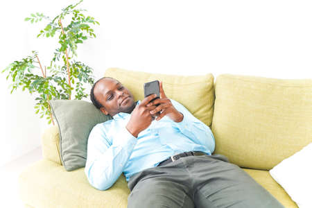 young happy mixed race man chilling and using smartphone on sofa during quarantine