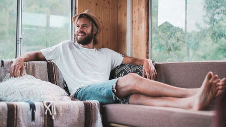 Young man laughing lying on a sofa with bread and a hat laughing inside a stylish mobile home in the woods