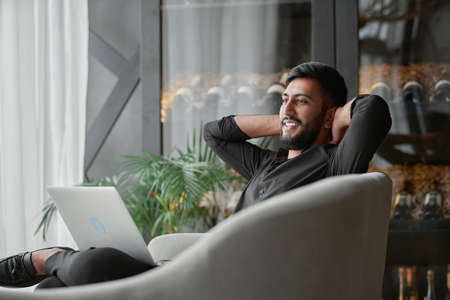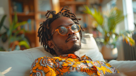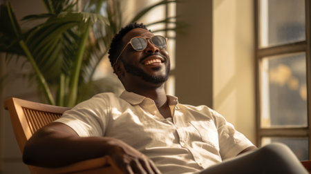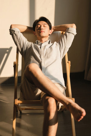 Handsome young man relaxing on a comfortable armchair in a cozy living room. He appears at peace and content in a warm, inviting setting.