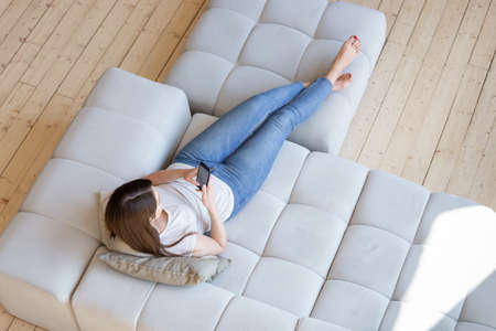 Top view of millennial female relaxing on couch at home holding smartphone in hands, calm young lady resting from work sitting on sofa surfing internet, shopping online or making call by mobile phone