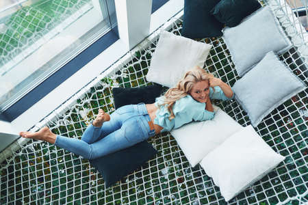 Top view of beautiful young woman smiling while relaxing in big hammock at home