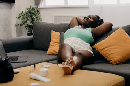 Happy plus size African woman with eye patches on face enjoying spa day at home