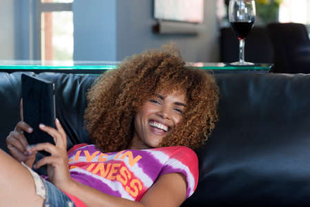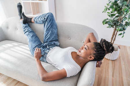 happy latin woman lying on white sofa getting dressed and smiling, lifestyle concept, copy space.