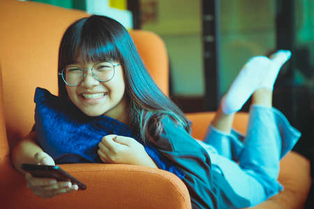 asian teenager toothy smiling face lying on sofa and holding smart phone in hand