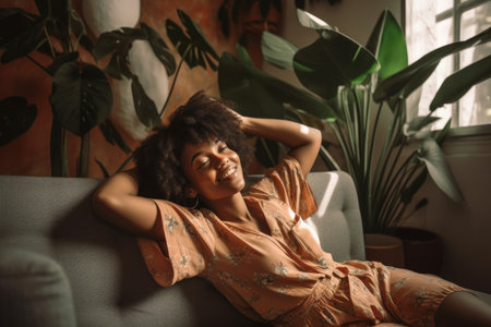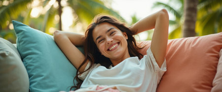 A radiant young woman lounges comfortably on a vibrant couch, surrounded by lush greenery and palm trees. Her carefree smile and relaxed posture exude happiness and tranquility, capturing the essence of a perfect day in a tropical paradise.
