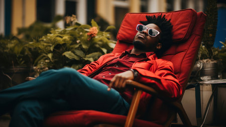 Young african american man in red coat and sunglasses sitting on a red armchair.