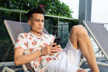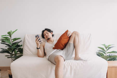 Bored Asian man relaxed and use smartphone for killing time alone in apartment.