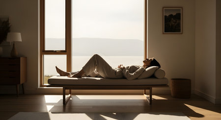 A woman peacefully relaxes on a modern daybed in a sun-drenched, minimalist living room. Sunlight streams through a large window that offers a serene view of water and hills. The tranquil scene embodies concepts of mindfulness, self-care, and finding peace at home.