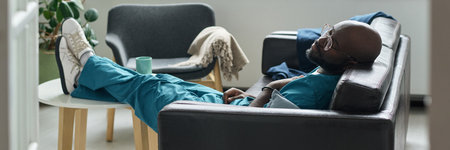 Healthcare worker in scrubs resting on couch in modern lounge area taking a break after a long shift