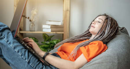 Young modern woman with dreadlocks is comfortably sitting in a chair bag at home and using a laptop for work, study or leisure. Concept of pastime, lifestyle and comfortable remotely work.