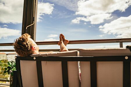 Young man in casual clothes and a cap is lying on a black wicker chaise longue on the seashore. A man is resting and relaxing on a sandy beach. Beautiful seascape in cloudy weather. Copy space.