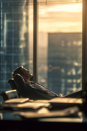 A young man, with light brown hair, relaxes in a chair as the sunset casts warm light through the office window, creating a serene atmosphere.