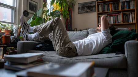 A man is laying on a couch with a book on his lap. The couch is surrounded by a lot of books, and there is a potted plant in the background. The man is relaxed and comfortable