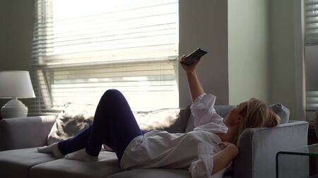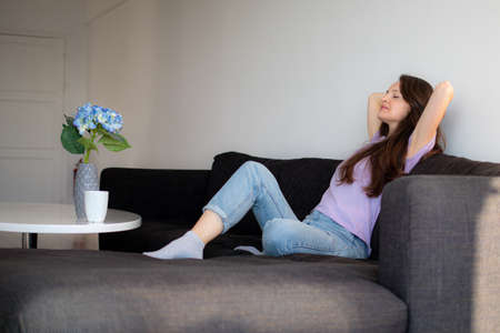 Young beautiful woman moves on the sofa and falls on it, enjoying her lifestyle and freedom.