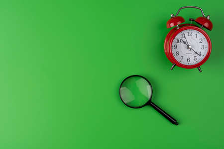 A picture of alarm clock and magnifying glass on green background with copy space, Searching time concept