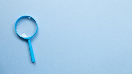 Close up magnifier glass or loupe isolated on blue background. Image photo