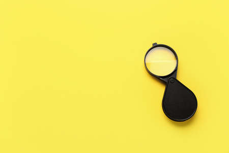 Magnifying glass in a gold frame on a yellow background. Copy space.