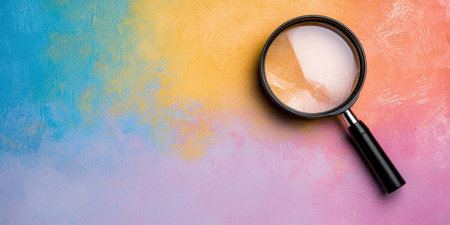 Magnifying glass on a colored background. Top view. Vertical photo. Copy space for text.
