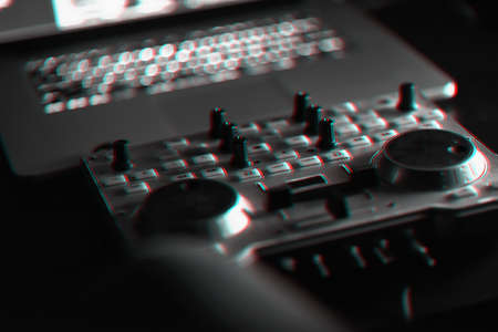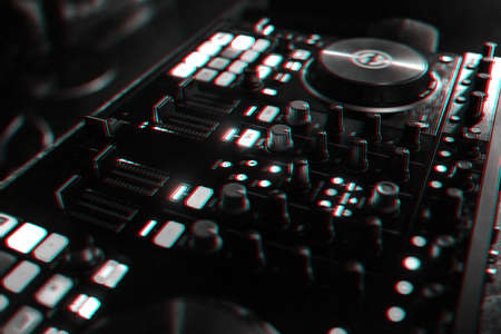 The details of your DJ controller, close. Macro in the dark, with lights. Nightlife
