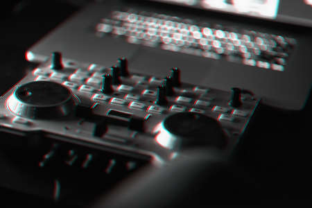 Club music concept. DJ console deejay-mixing desk in dark with colorful light. Mixer equipment entertainment DJ station. Selective focus