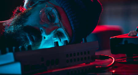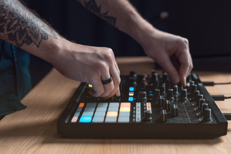 DJ hands with tattooes touch buttons and sliders, playing electronic music. Art. Concept of party, night club and techno music.