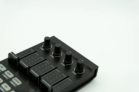 midi controller for disc jockey,sound producer & composer.Create electronic musical tracks with modern digital beat machine with knobs and pads isolated on white background, music concept