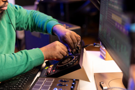 blurred image of male hands using midi controller, making urban and electronic music, creating commercial music beat in home studio, music industry concept.