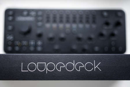 Paris, France - Sep 20, 2019: Man hand holding against gray background new Loupedeck Plus photo and video editing console