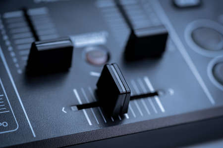 Audio sound mixer console. Sound mixing desk. Music mixer control panel in recording studio. Audio mixing console with faders and adjusting knob. Sound engineer. Sound mixer control radio broadcasting