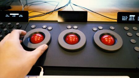 Behind of telecine controller machine and colorist man hand editing or adjusting color on digital video movie or film in the post production stage which very technical in the dark room lab.