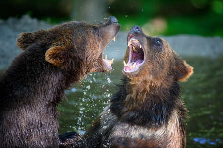 Two Wild Brown Bear (Ursus Arctos) play or fight on pond in the summer forest. Animal in natural habitat. Wildlife scene