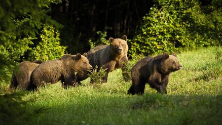 brown bear, ursus arctos, family with dangerous mother and young cubs approaching in spring at sunset. Group of wild mammal with fur walking on fresh green glade on sunny day.
