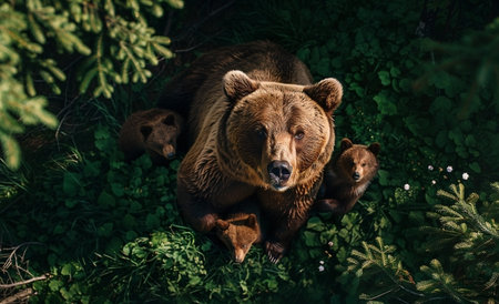 Brown bear with cubs in the forest. Wildlife scene from nature