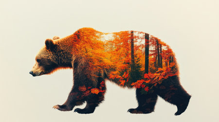 Stunning double exposure artwork featuring a bear silhouette filled with an autumn forest, blending wildlife and nature in vibrant colors.