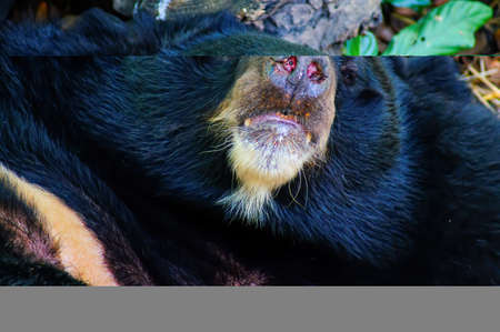 Closeup to the face of an adult Formosa Black Bear holding a wooden stick with the claws in the forest. Ursus Thibetanus Formosanus