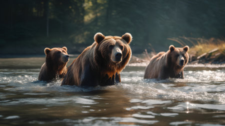 A group of Brown Bears (Ursus arctos) fishing for salmon in Alaska's Brooks River, their large bodies and powerful claws a breathtaking spectacle against the flowing water.
