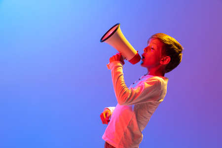 Young beautiful happy girl in white blouse shouting at megaphone isolated on pink background in neon light. Concept of emotions