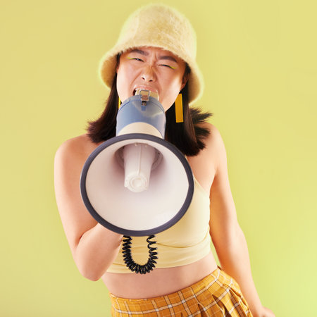 Asian, woman and studio with megaphone for protest, speech and activism for human rights by background. Young gen z model, loudspeaker broadcast and yellow 90s aesthetic for change, justice and voice