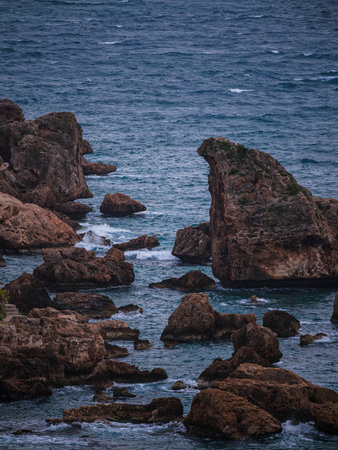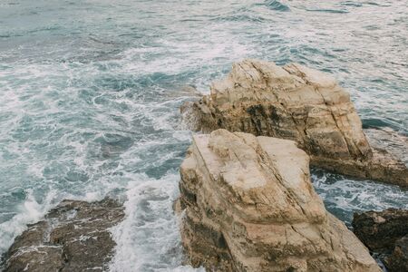 Rocks on the sea in Montenegro. Rocky coast. Wild beach. Dangerous coast.