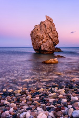 Aphrodites Rock or Petra tou Romiou, the birthplace of Goddness Aphrodite, Paphos, Cyprus. Amazing sunset seascape with rock and sea pebbles