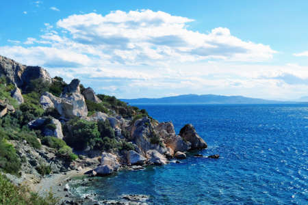 wild colourful landscape of rocky islands at the sea with the line of the horizon and a blank space for the text