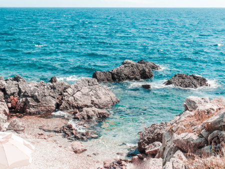 Rocky shore of split, croatia. Multiple rocks in the beautiful blue sea. Island shore in the distance