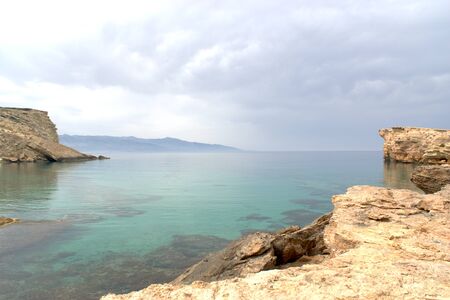Greece, the island of Koufonissi. Clouds are building, a storm is approaching, but the waters of the Aegean sea are placid and still.