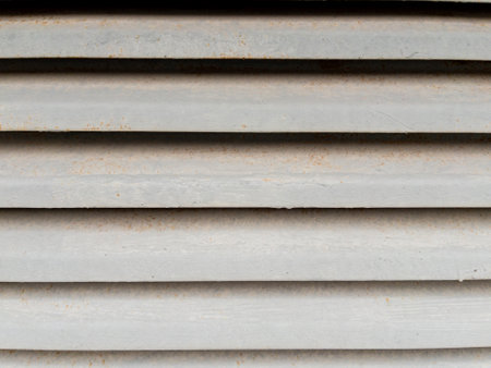 Close-up of a fragment of a fence made of gray horizontal metal panels imitating boards. Background. Texture.