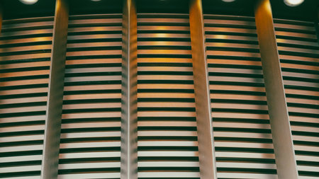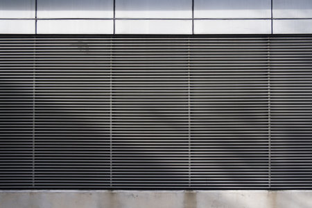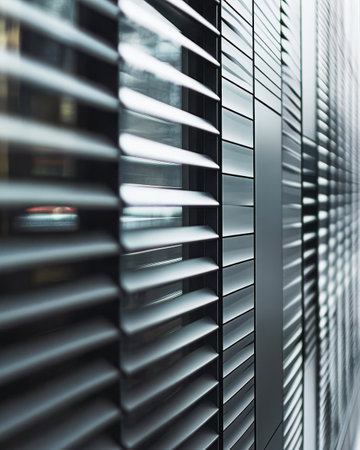 A close-up view of a sleek building facade featuring metallic louver panels. The architectural design emphasizes lines and light interplay in an urban setting creating a contemporary look.
