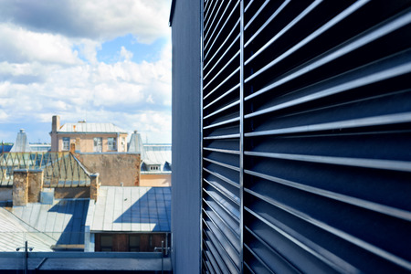 Lines stretching into perspective on the terrace of a modern building on a background of roofs and chimneys in the clouds of the old city of Riga summer day